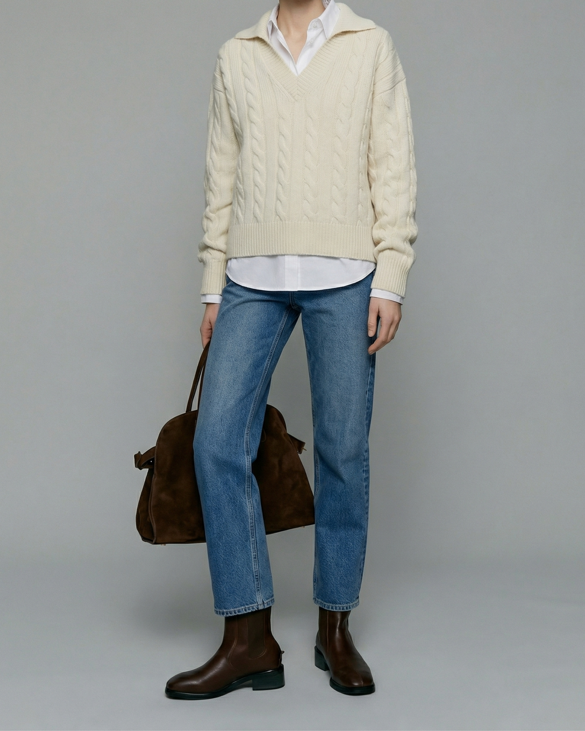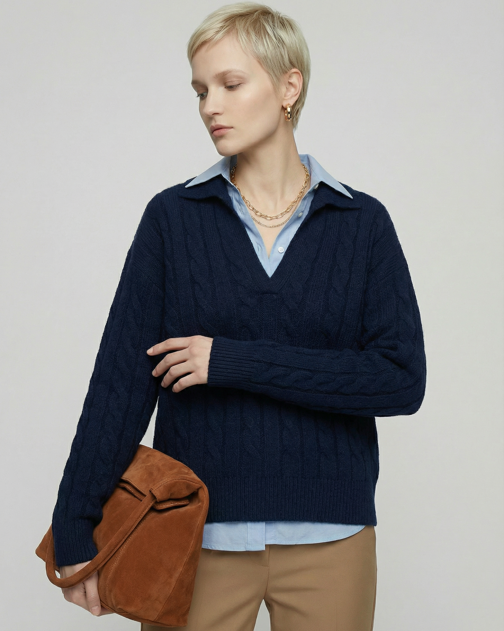 ウール100%のケーブル編みニットです。毛ならではの自然な保温性と、ほどよい厚みで1枚でもレイヤードでも活躍できます。