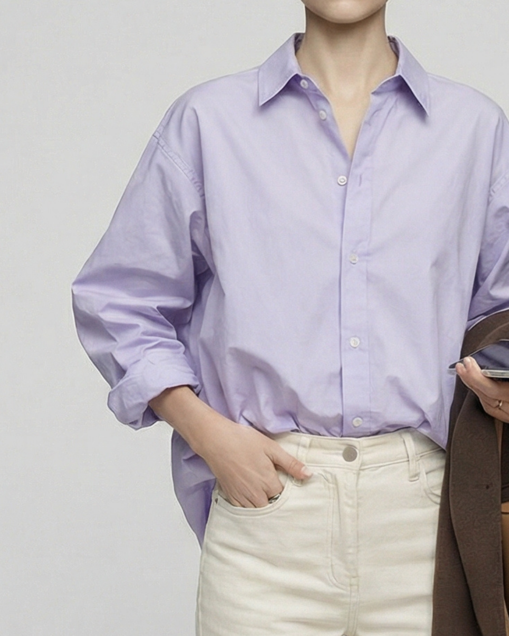 柔らかなラベンダーカラーが印象的な、軽やかな着心地のコットンシャツ。