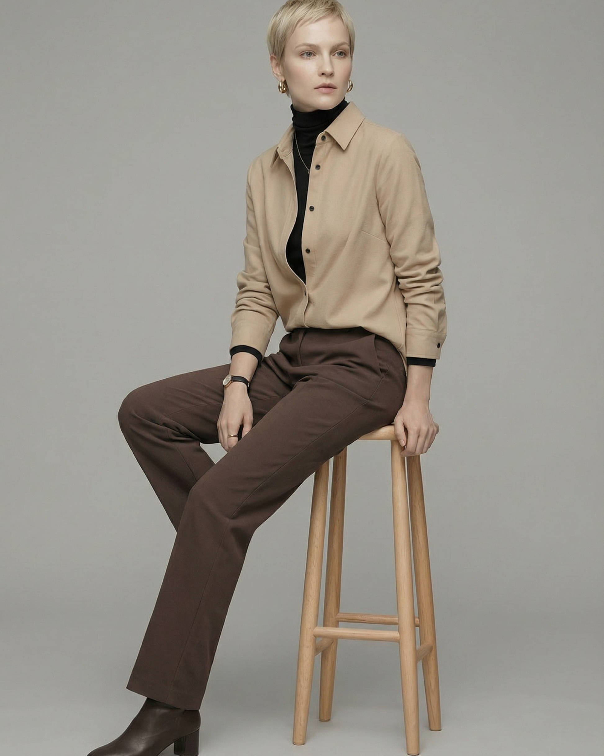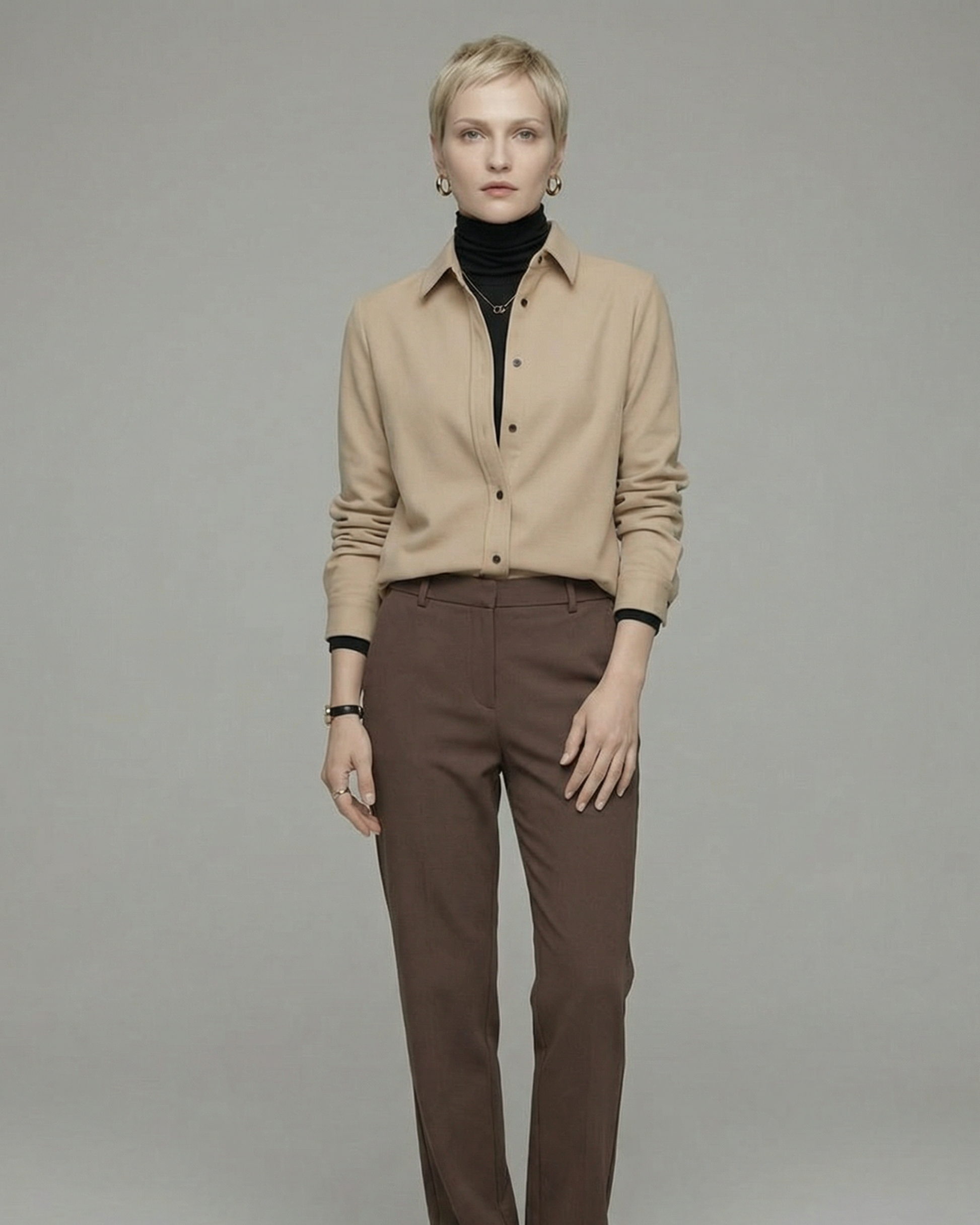 黒いボタンがワンポイントの起毛シャツ。インナーはボタンと同色の黒のタートルネックなどを重ねるとコーデがぐっと洗練されます。
