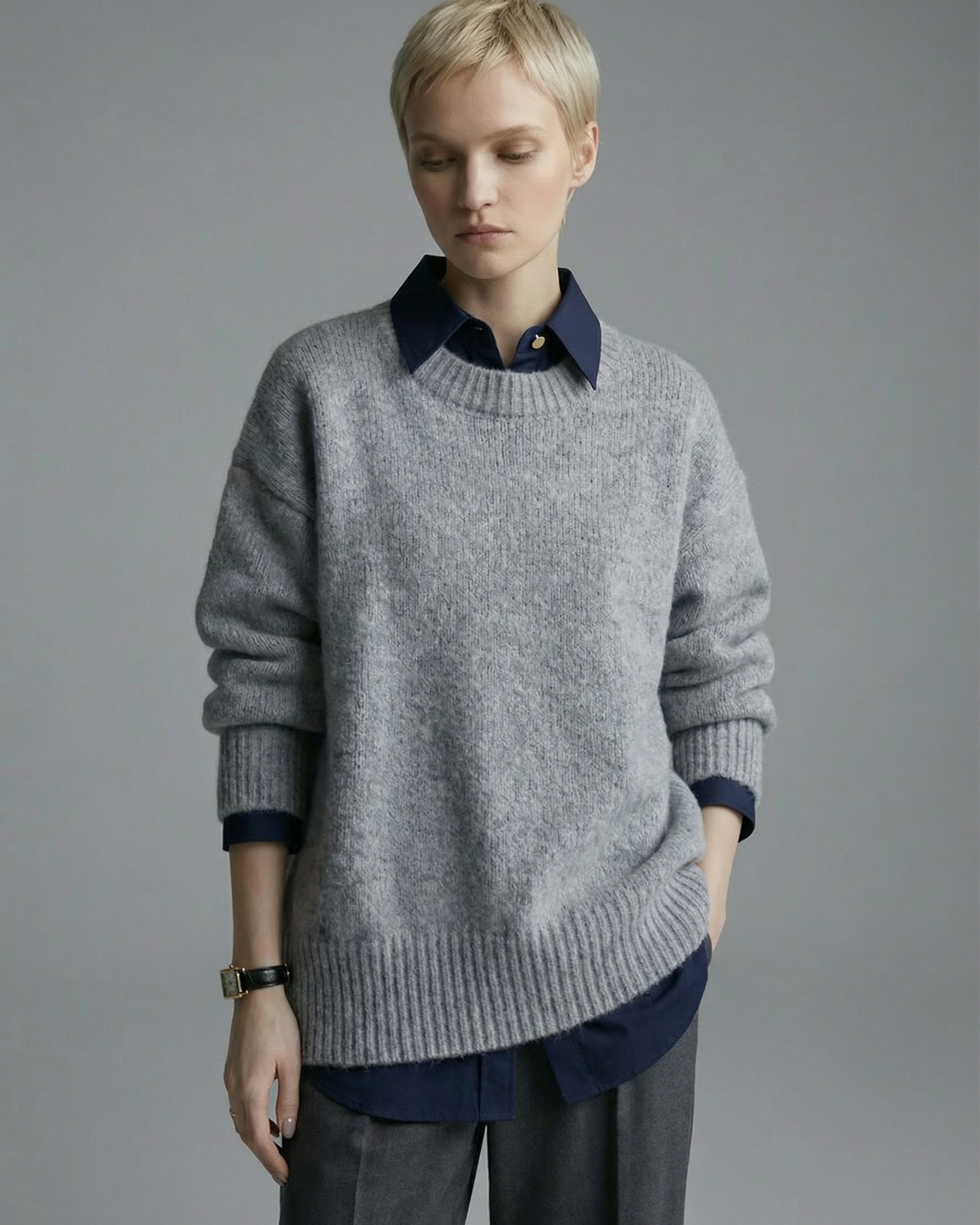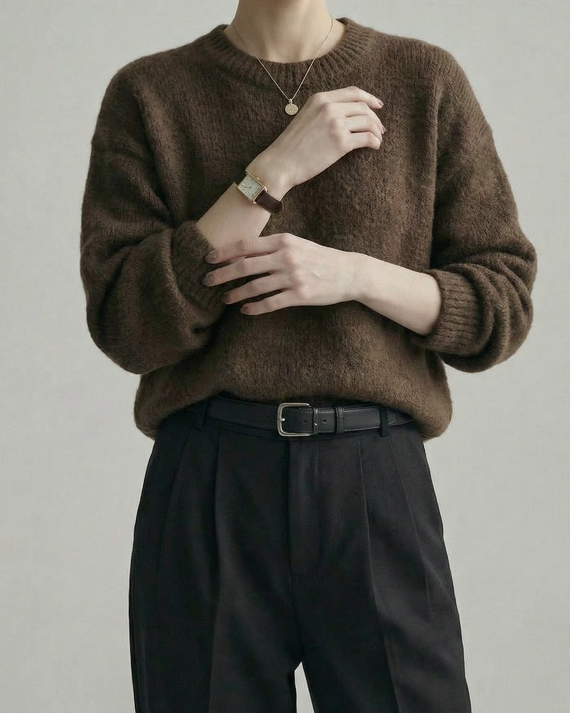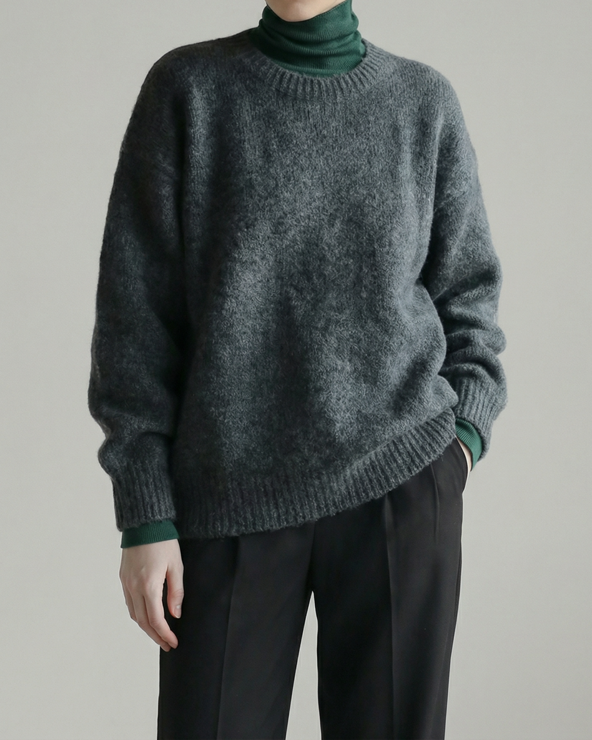 首元は詰まりすぎないラウンドネック仕様で、生地表面は起毛感を抑えた落ち着いた質感です。中にインナーを重ねても着膨れしにくい仕上がりです。