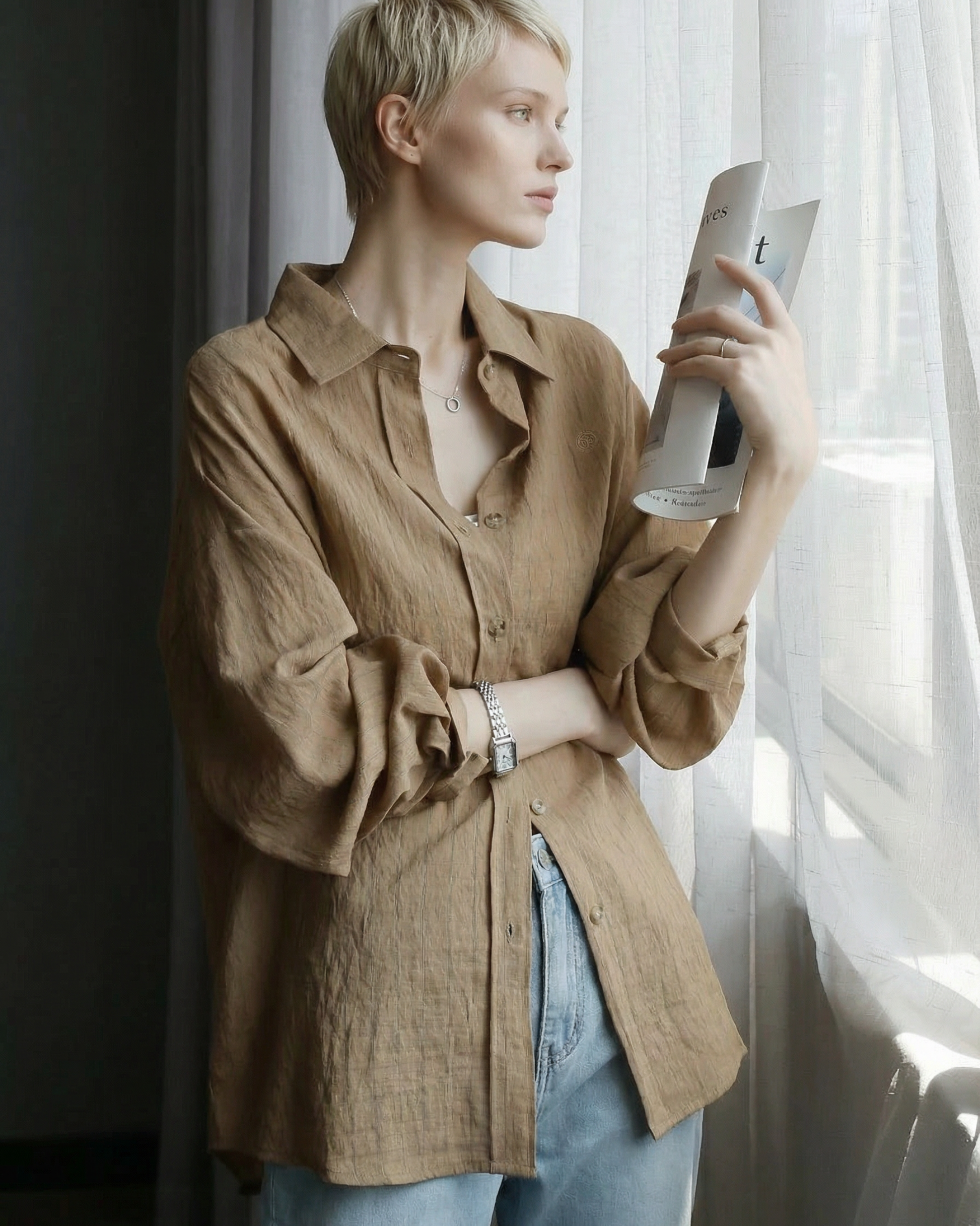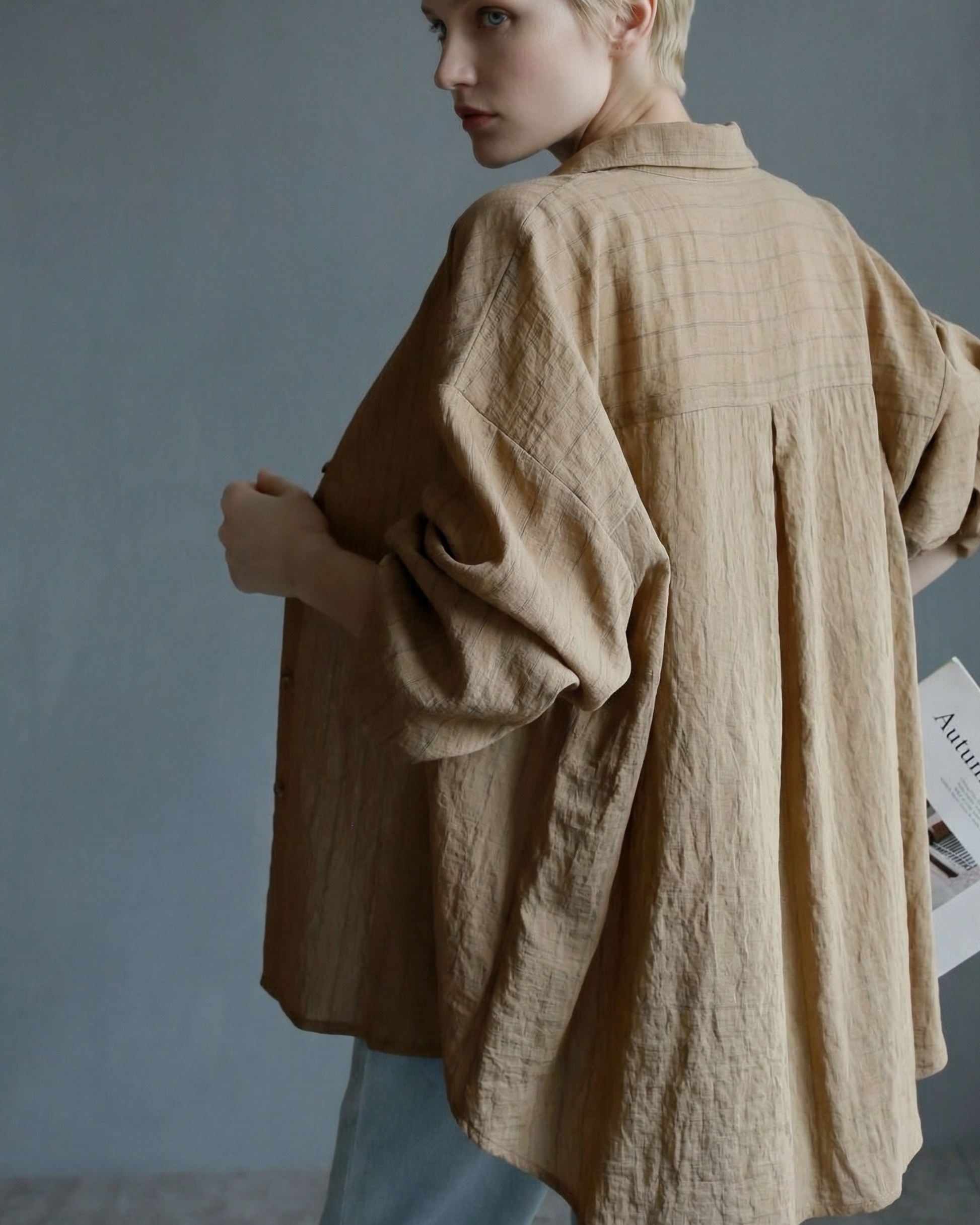 細かな縦ストライプの織り柄が入った春シャツです。淡い色合いなのでくっきりした色立ちのインナーやボトムスと相性◎。