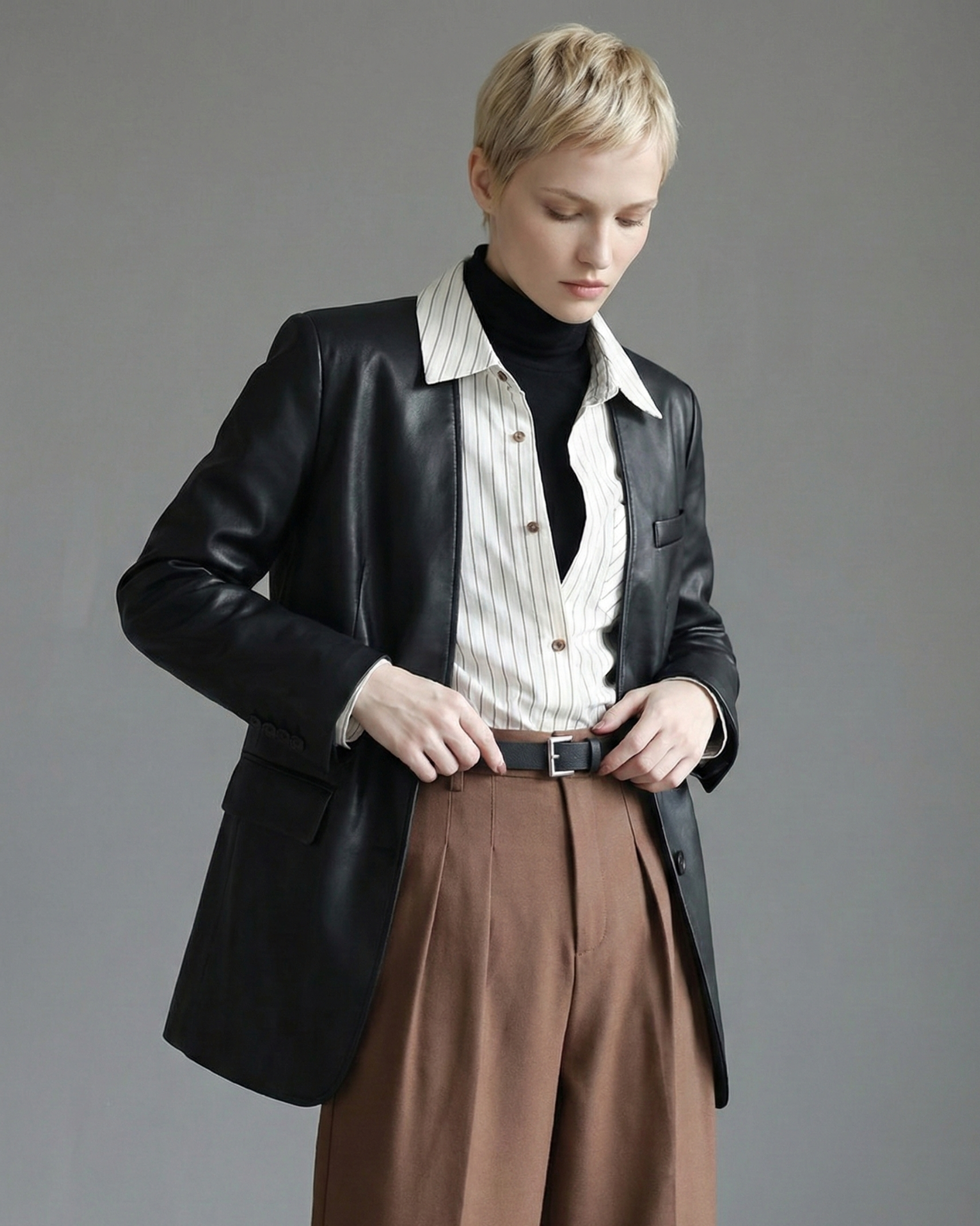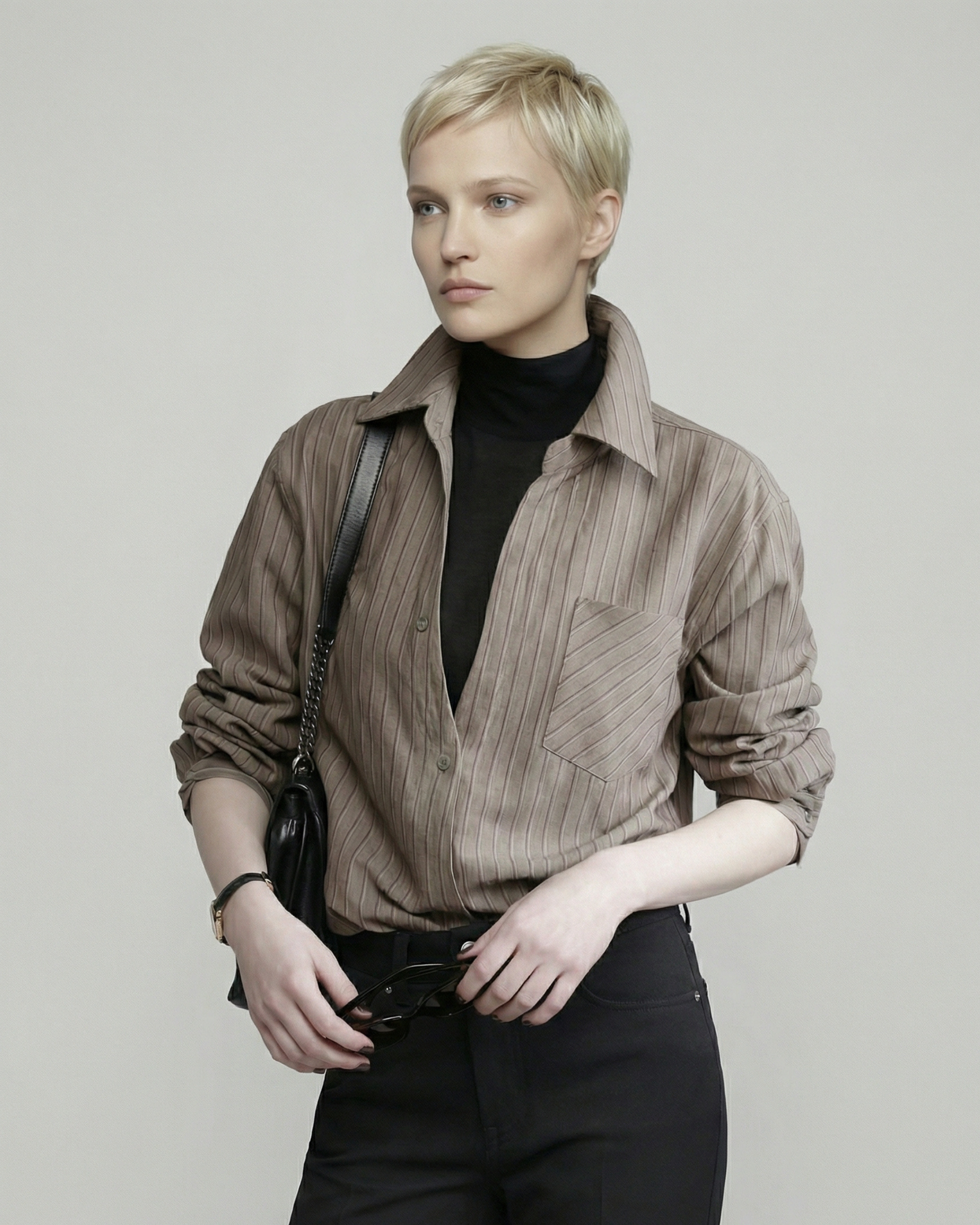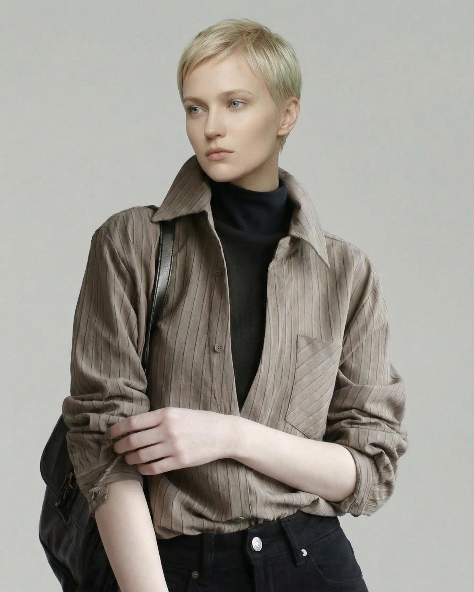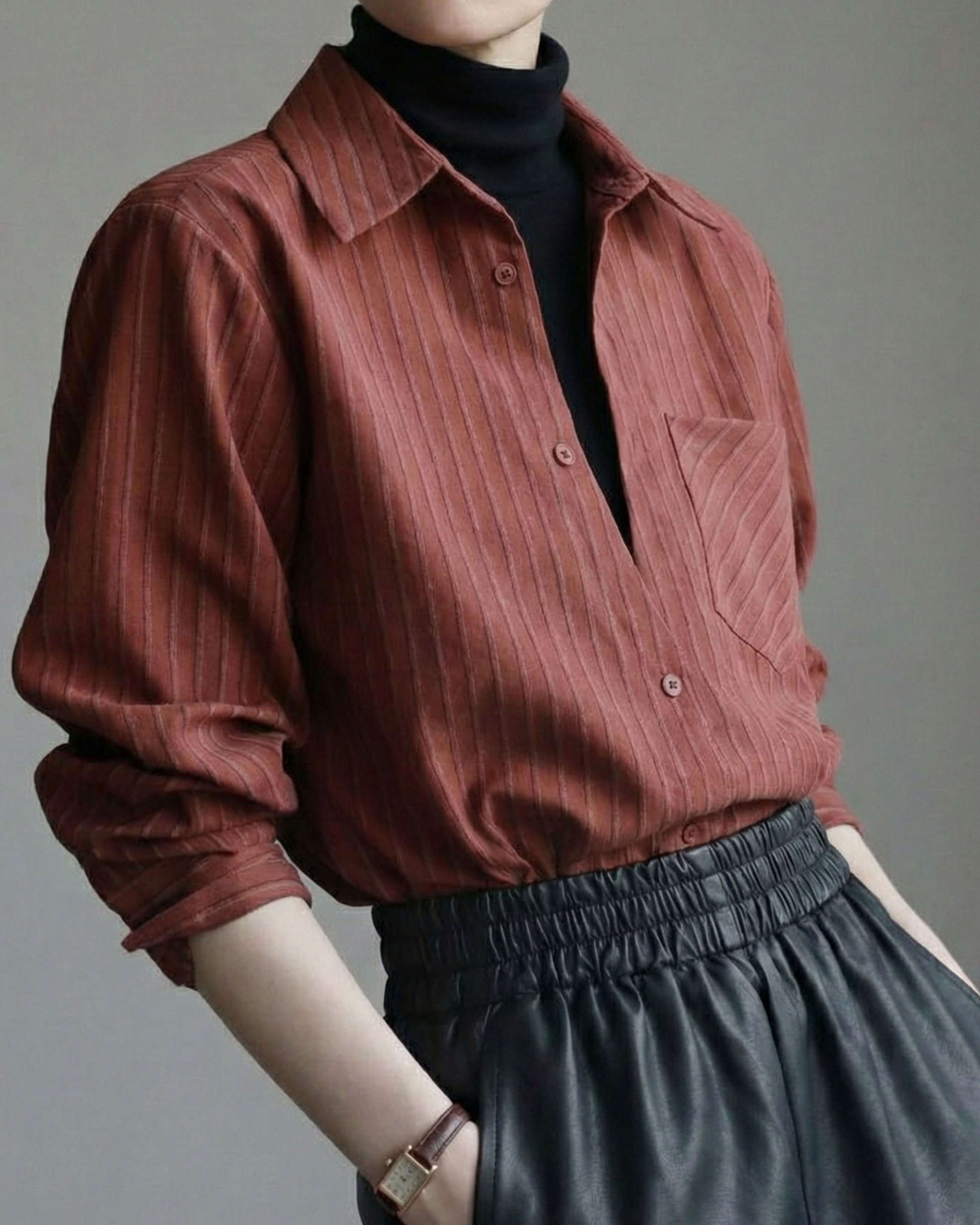 内側にフェイクの黒ハイネック生地を重ねたレイヤードシャツです。パンツやタイトスカートと合わせて、縦に流れる直線的なコーデが楽しめます。