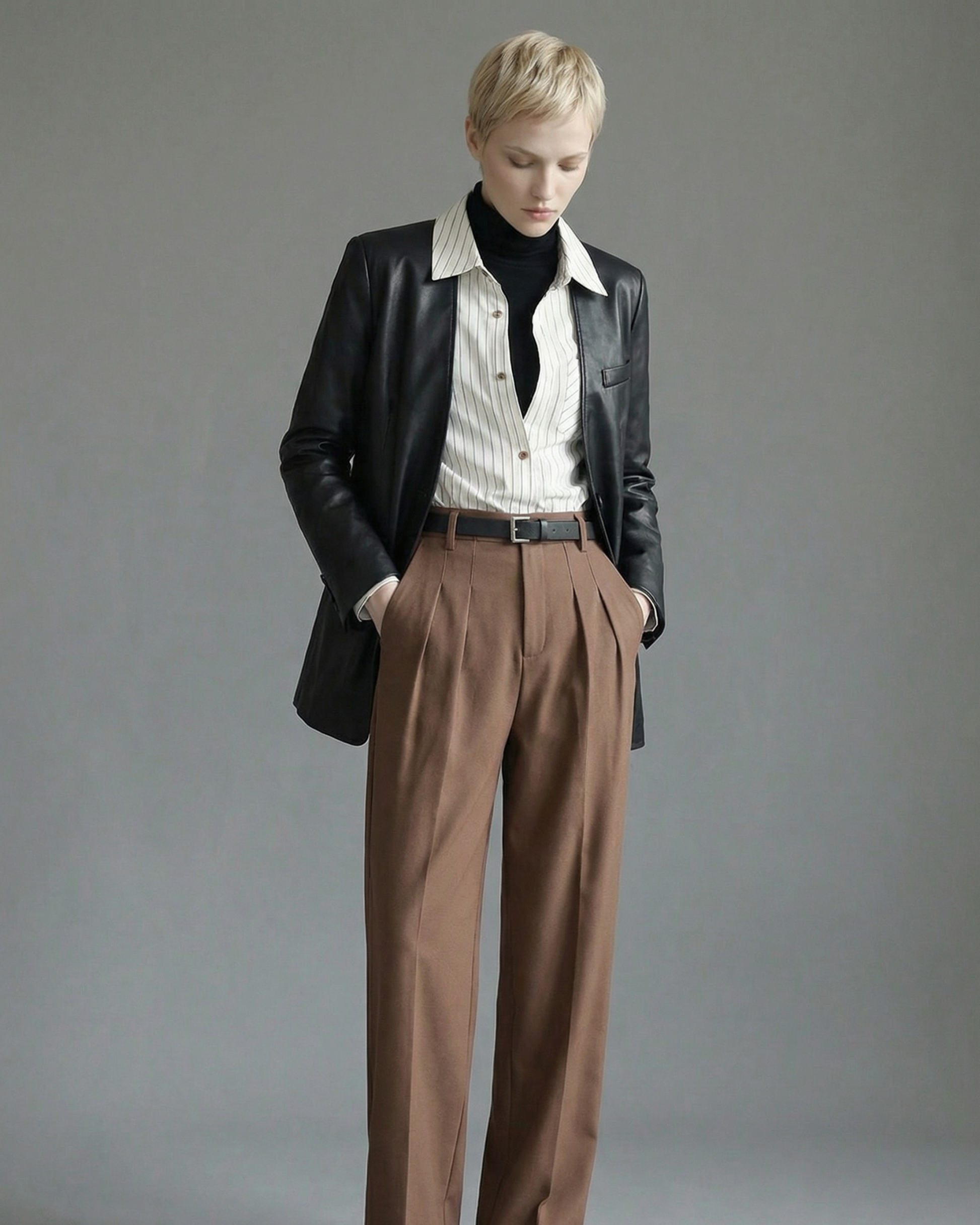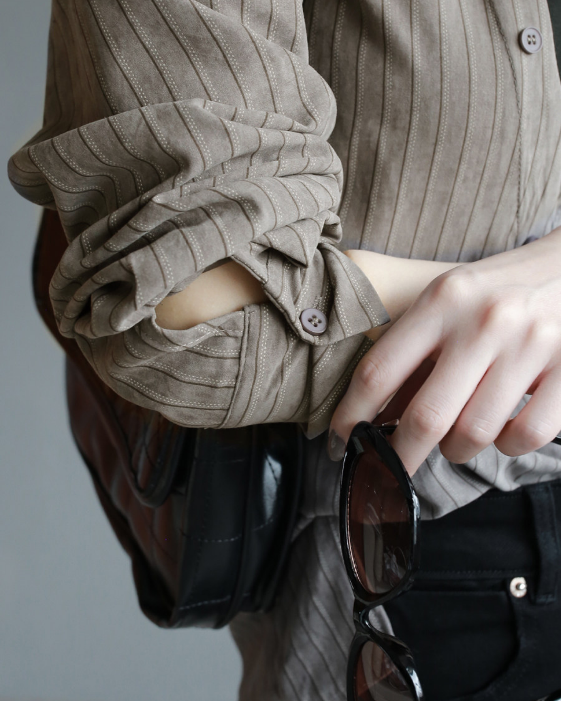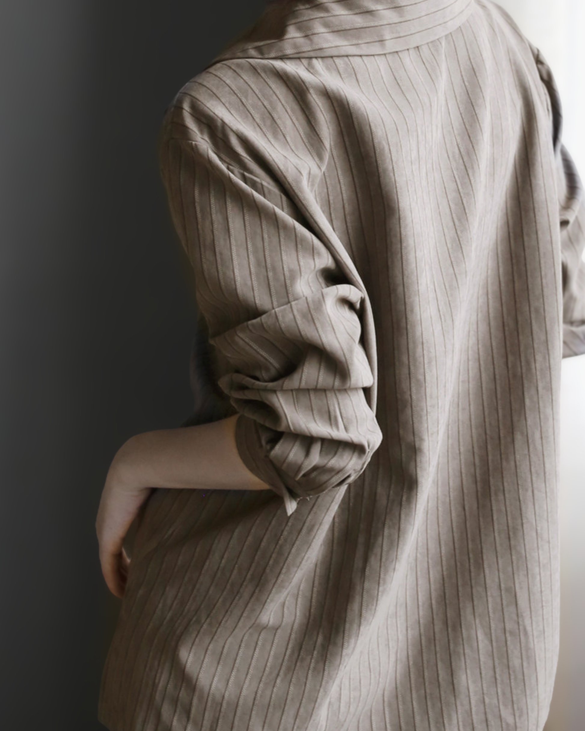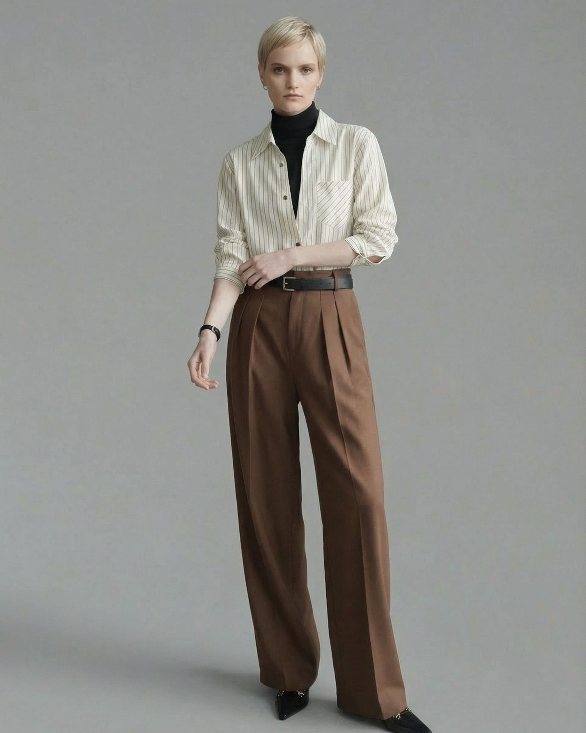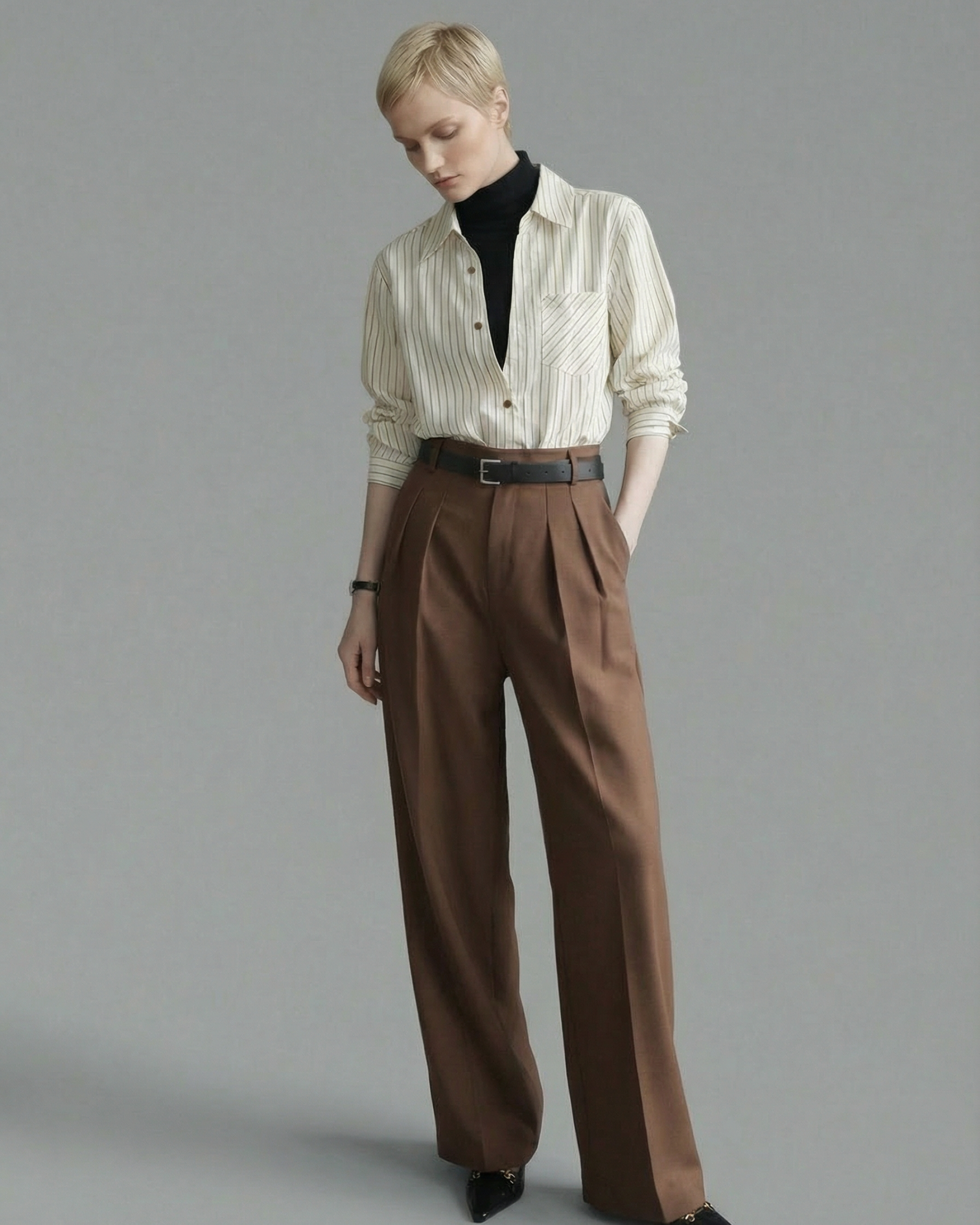 内側にフェイクの黒ハイネック生地を重ねたレイヤードシャツです。パンツやタイトスカートと合わせて、縦に流れる直線的なコーデが楽しめます。
