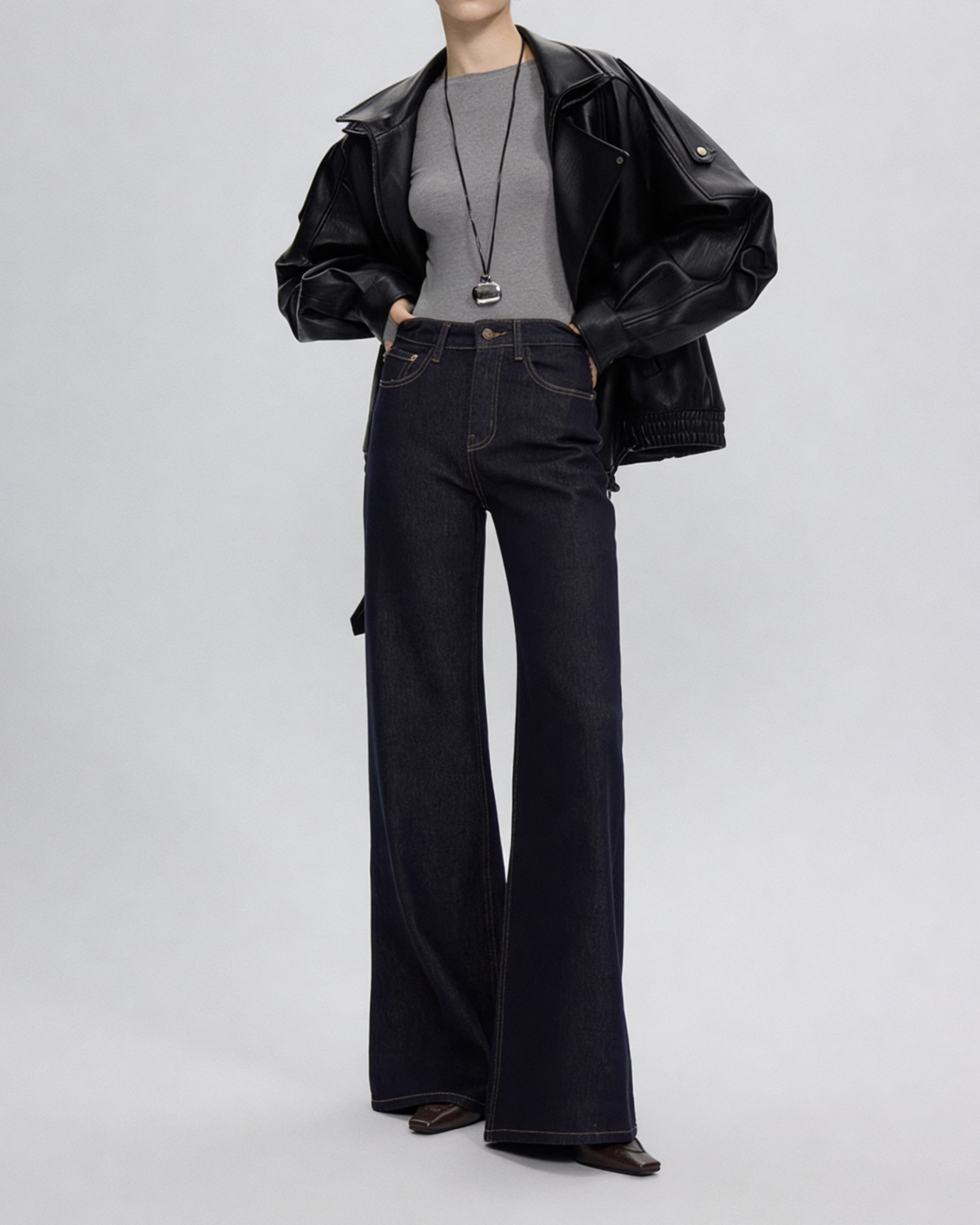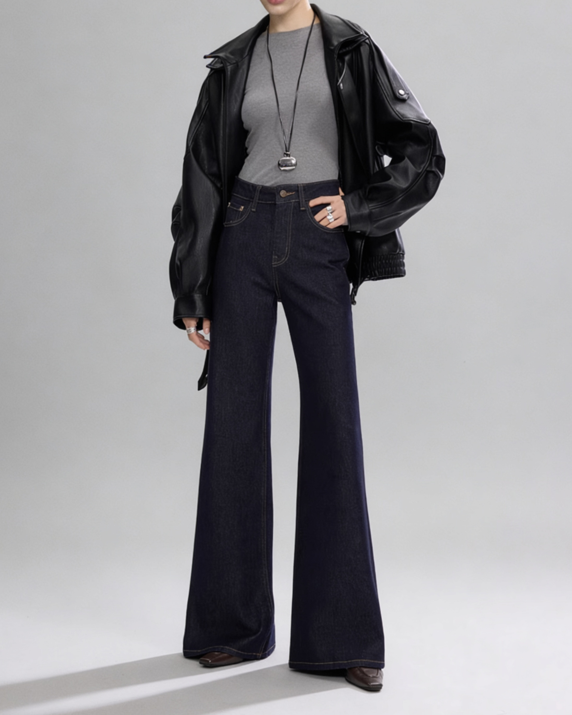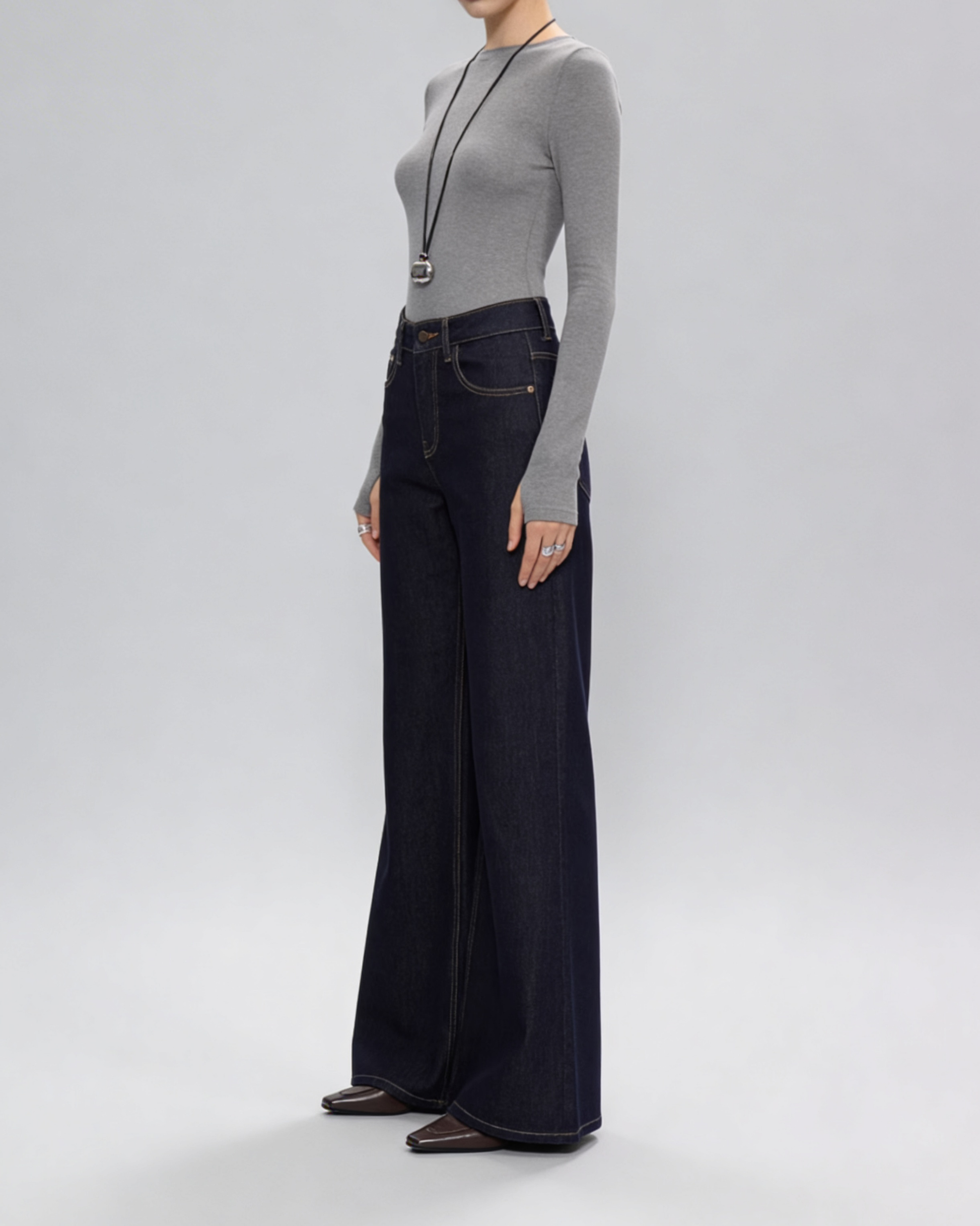 脚のラインをまっすぐ綺麗に見せるストレートワイドデニム。落ち着いた色味なので大人カジュアルになりすぎず、王道きれいめコーデとして活躍します。