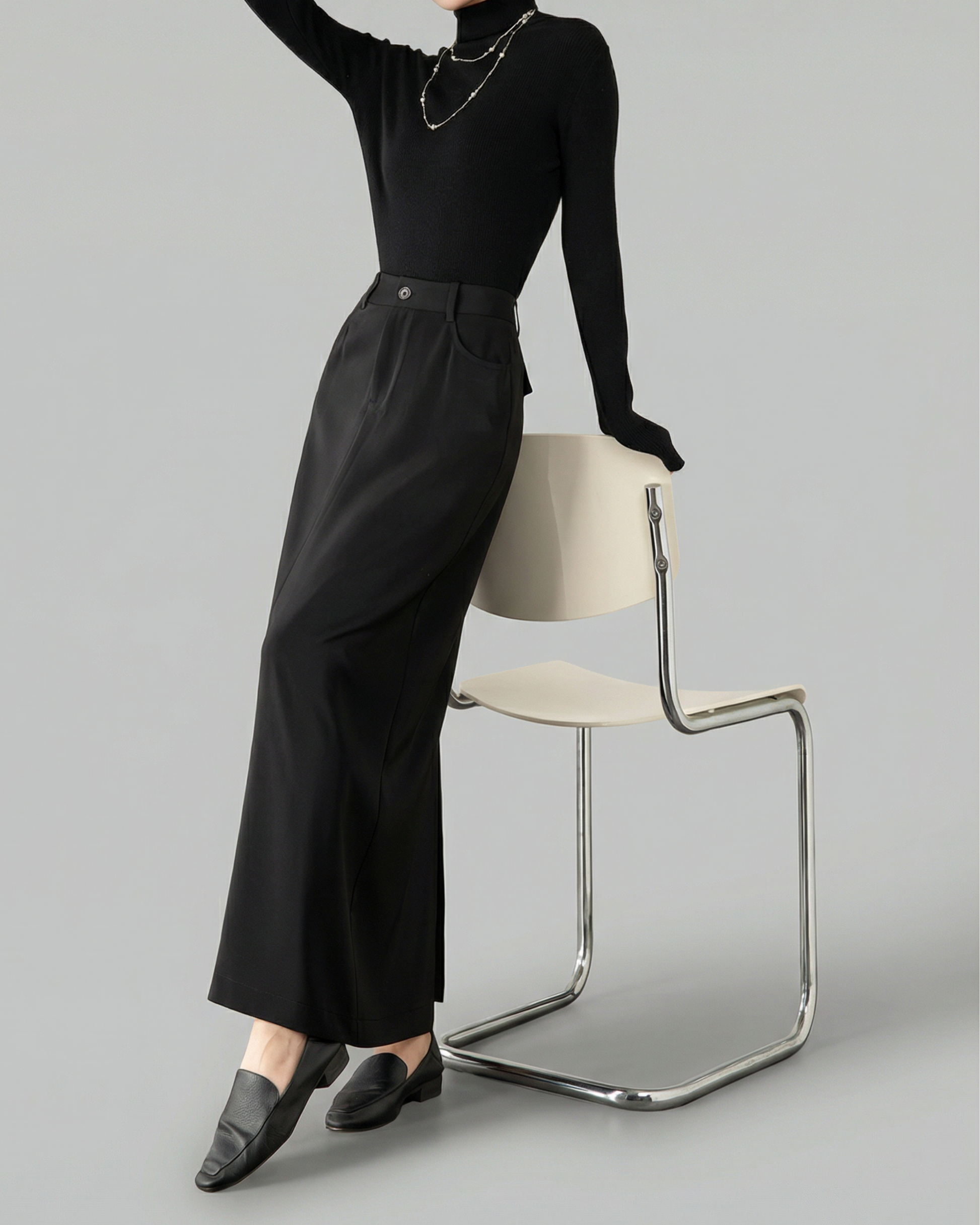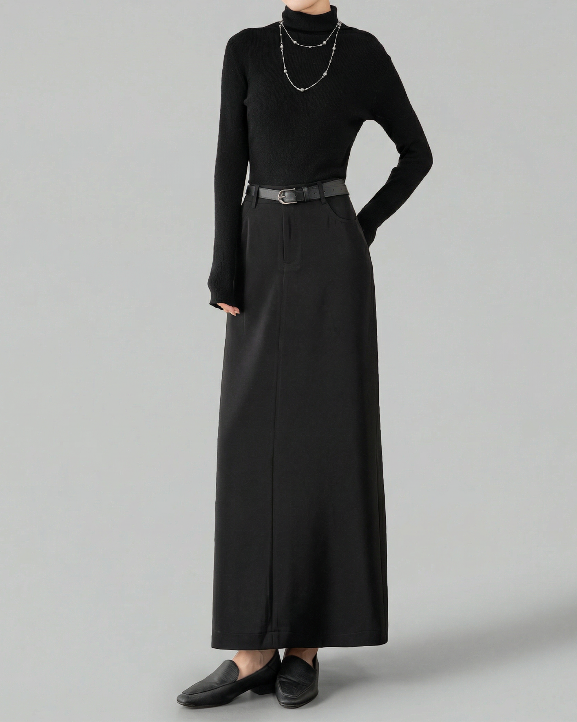 ヒップから裾にかけて自然に広がるシルエットが体のラインを拾いすぎず縦の印象を作り出します。
