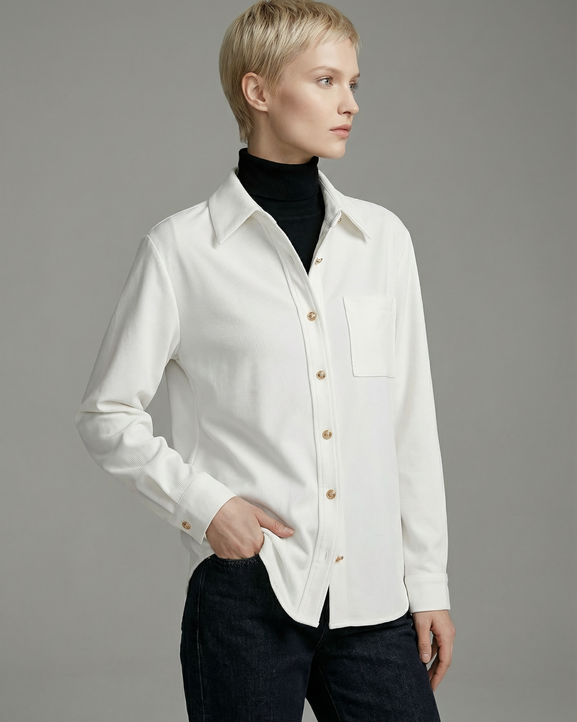 金ボタンを使用したフレンチスタイルのシャツです。同系色のボトムスと合わせて着ると洗練されたコーデになります。