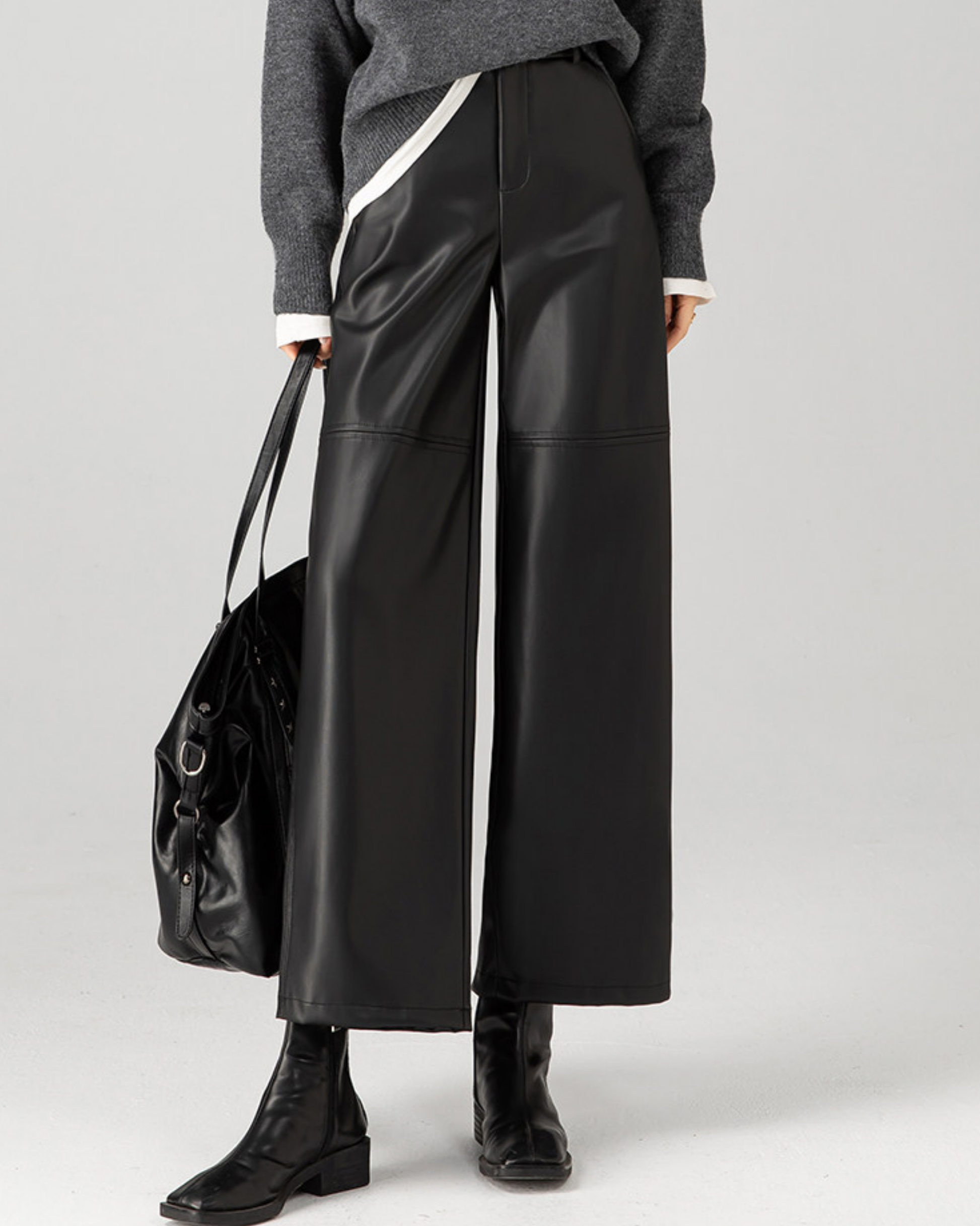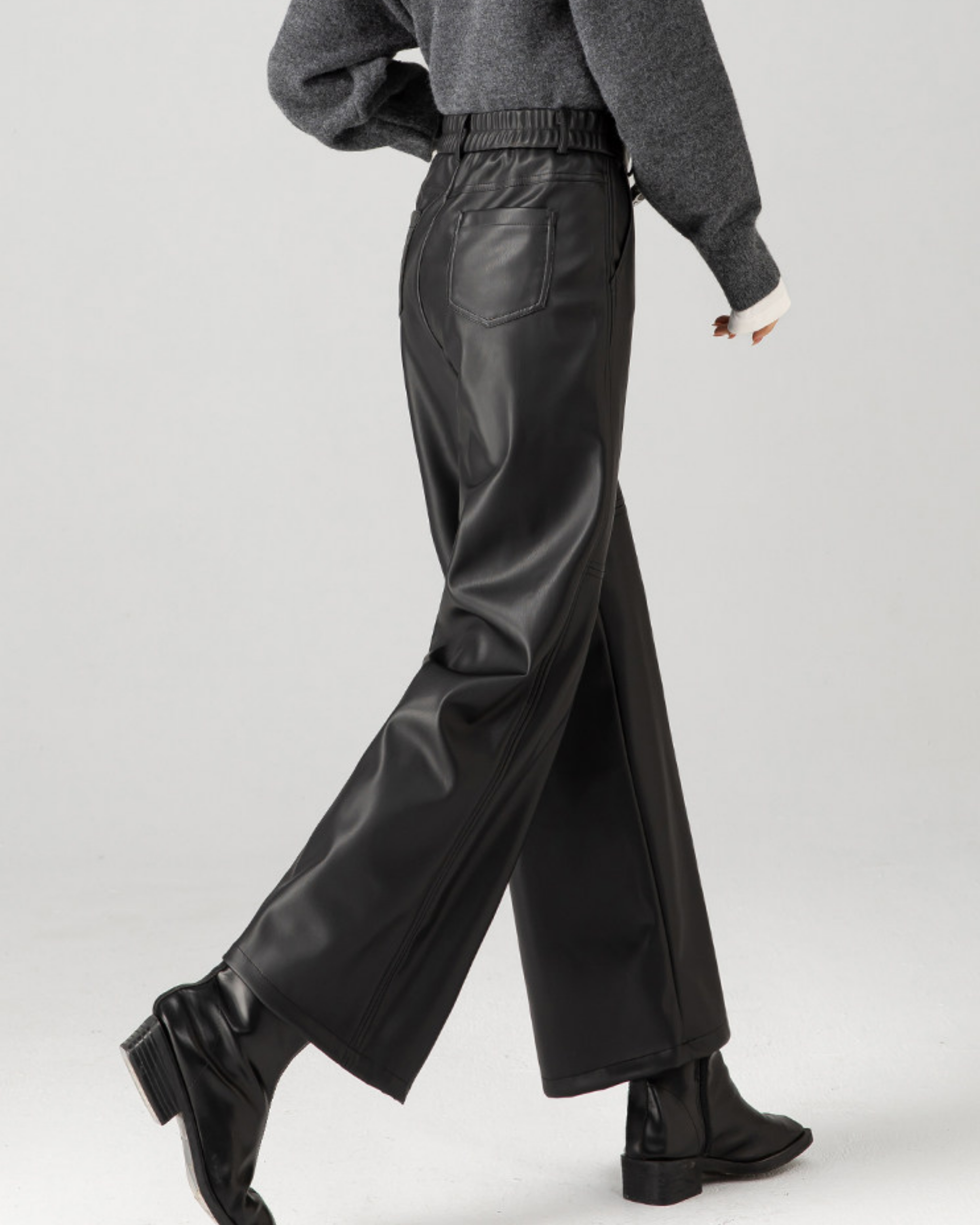 マットな艶感が上品な合成皮素材を使用した九分丈のワイドパンツです。