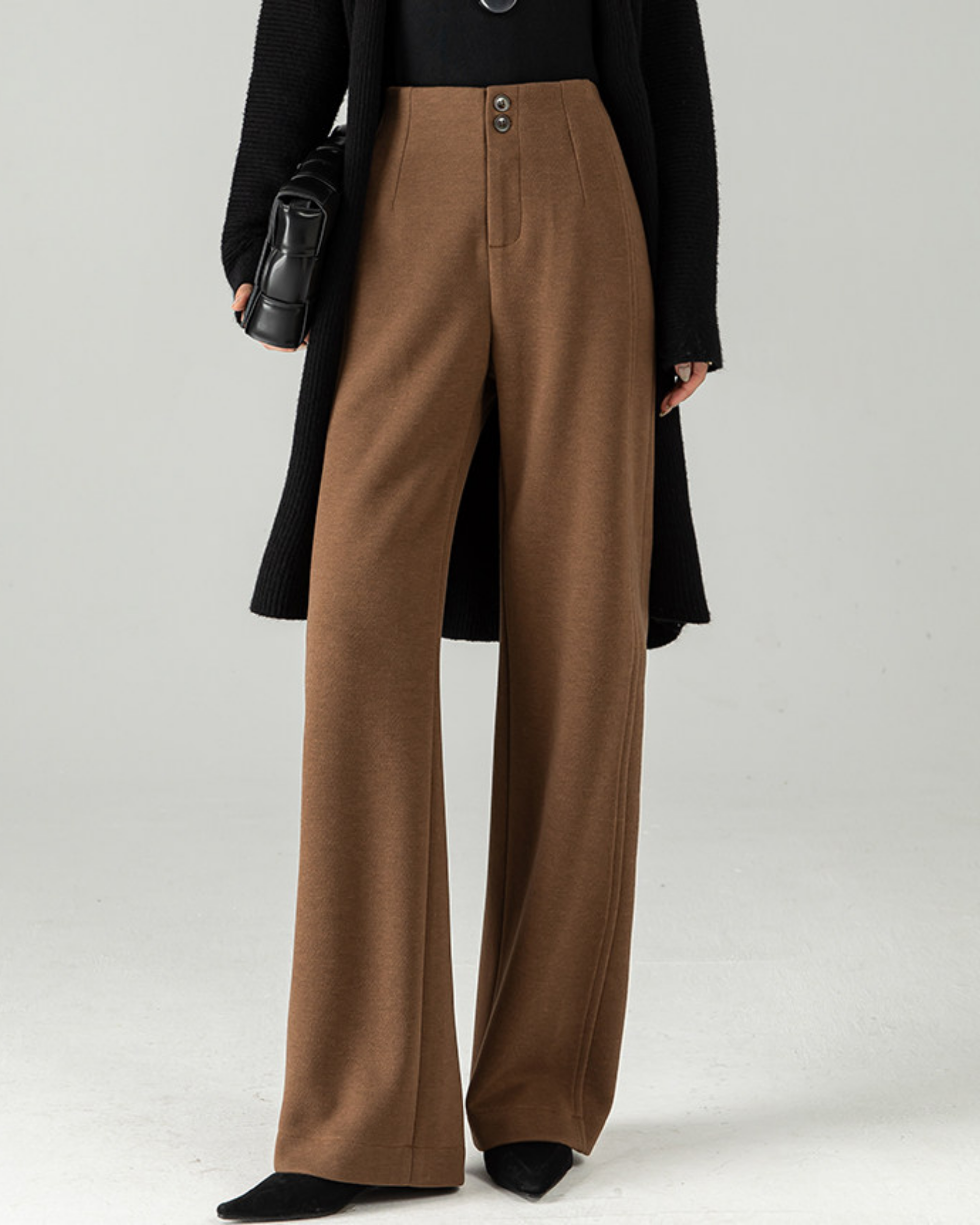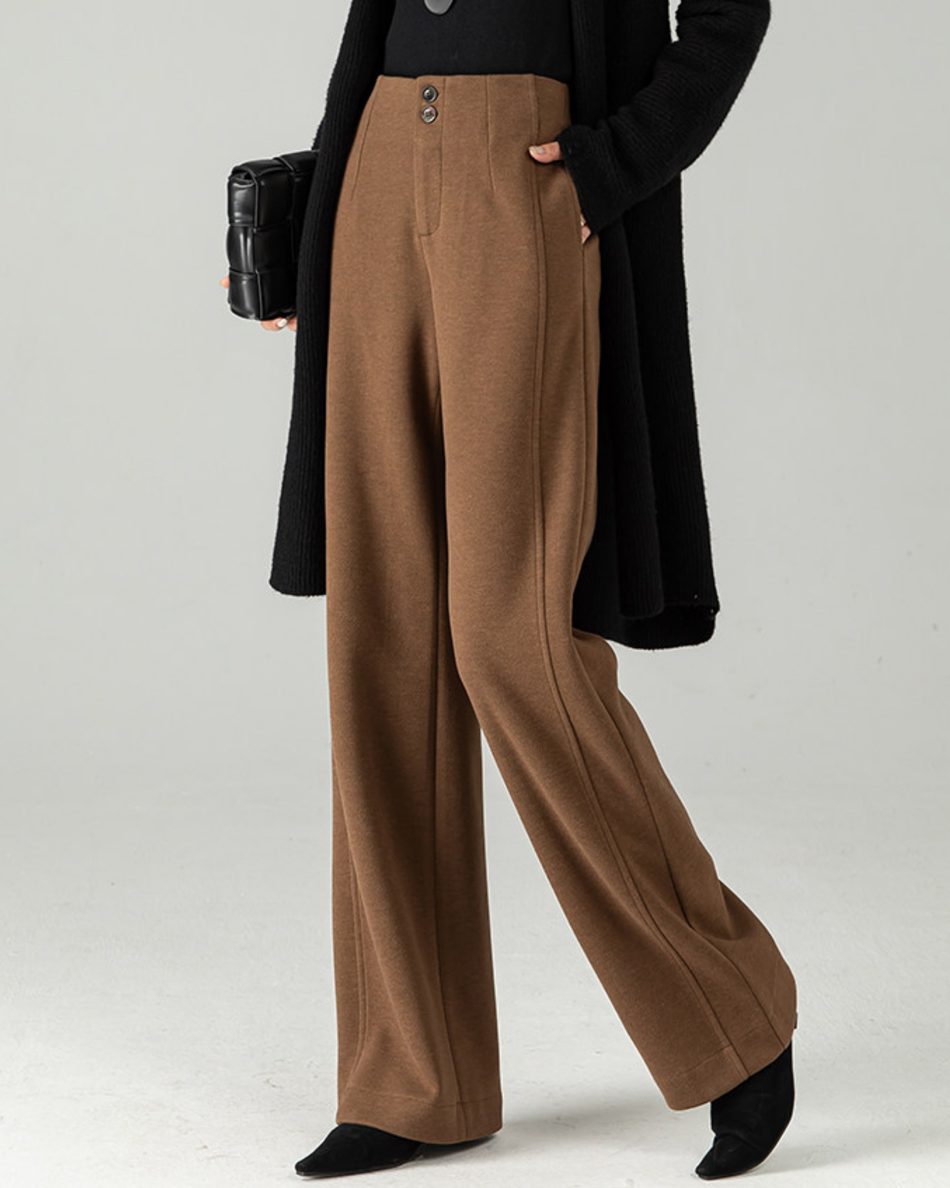 表面はスーツ調の上品な質感、内側はやわらかな起毛仕上げのハイウェストワイドパンツです。裏起毛なので冷えやすい季節でも、タイツなしで履ける安心感があります。