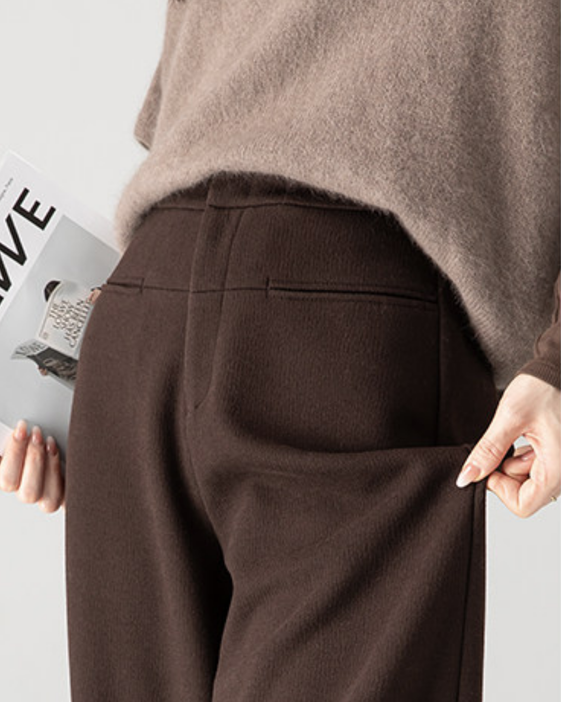 柔らかく起毛感のあるウール混素材を使用した、冬向けのワイドパンツです。